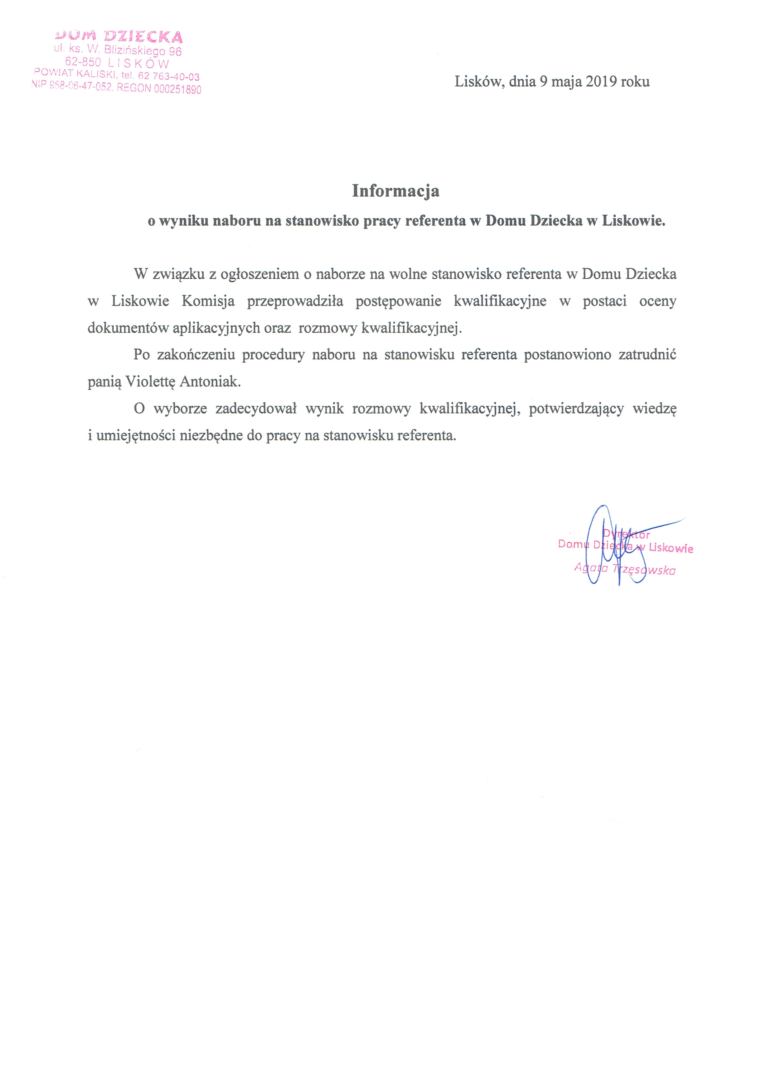 Informacja o wyniku naboru na stanowisko referenta w Domu Dziecka w Liskowie